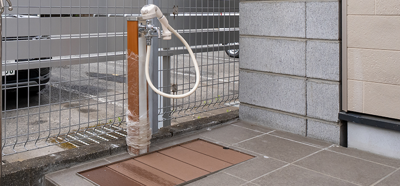 敷地内に設置。散歩帰りにすぐ洗えて衛生的